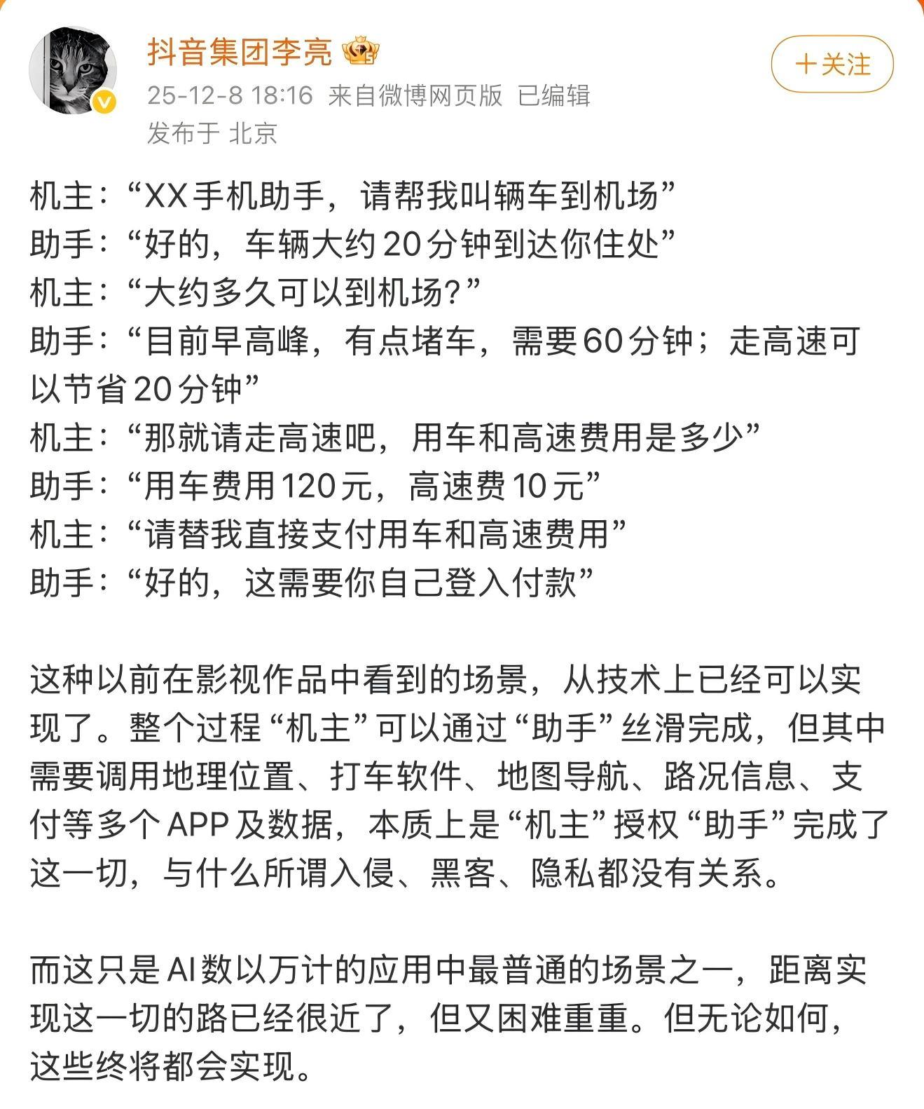12月9日,字节跨越旗下抖音副总裁李亮发微博道及豆包与中兴引诱推出的AI手机助手,李亮以为,AI带来的变革是真正存在的,用户需求亦然真正存在的,豆包和中兴的探索是一个开动。此前一天,李亮以打车场景例如,先容了面前手机在达成复杂需求时的自动化操作。他强调,该功能的本体是机主授权助手完成操作,属于正当合规的数据使用边界。